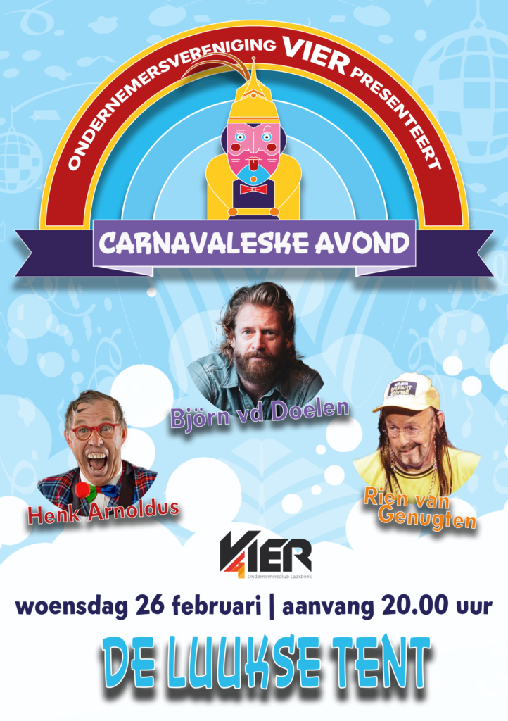 Een carnavaleske avond voor ondernemers (en hun personeel) met topgasten Björn van der Doelen, tonprater Rien van Genugten en tafelgoochelaar Henk Arnoldus. Dat is wat ondernemersvereniging VIER iedereen aanbiedt op woensdag 26 februari in de Luukse tent op het Heuvelplein in Beek en Donk.